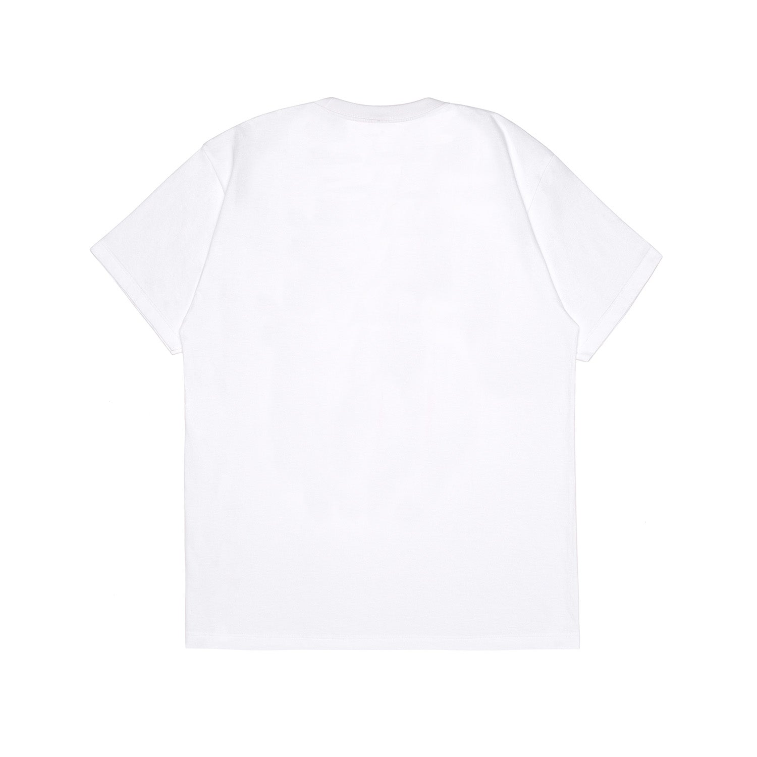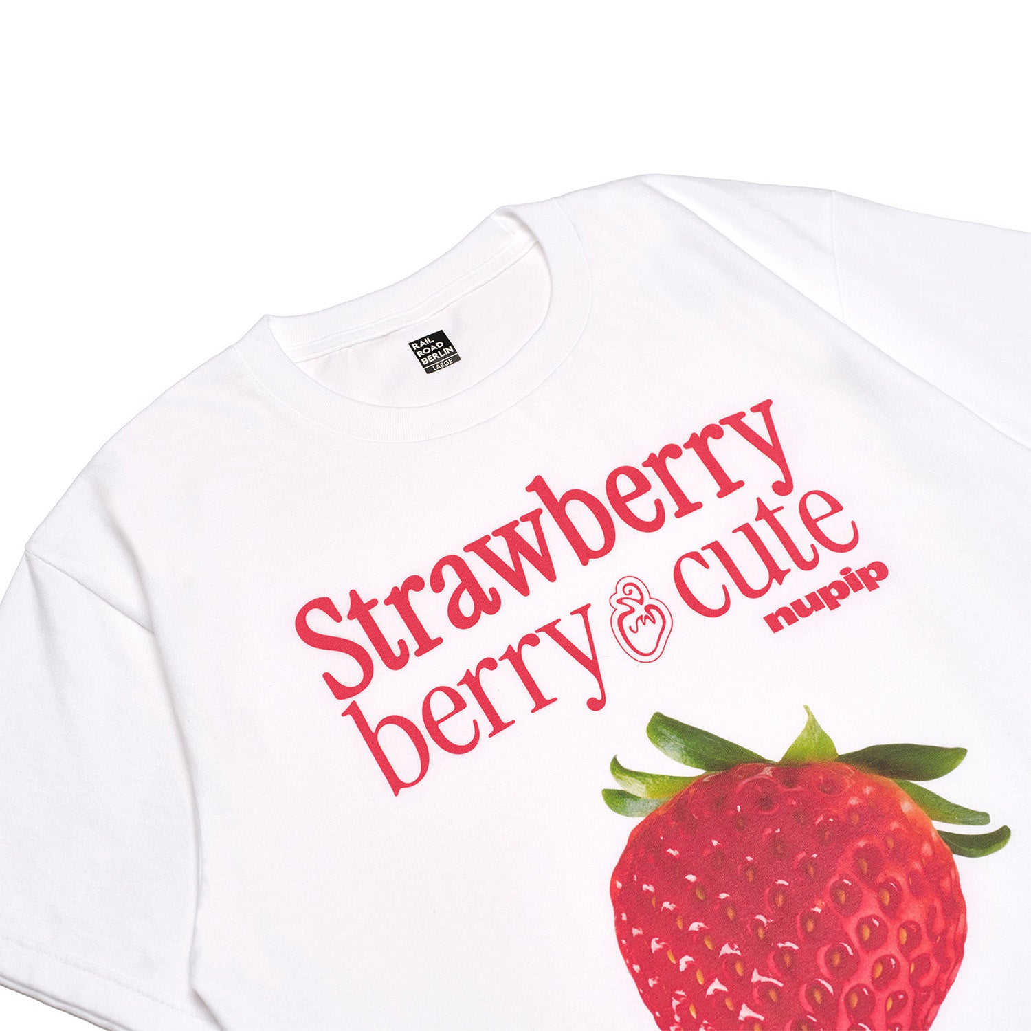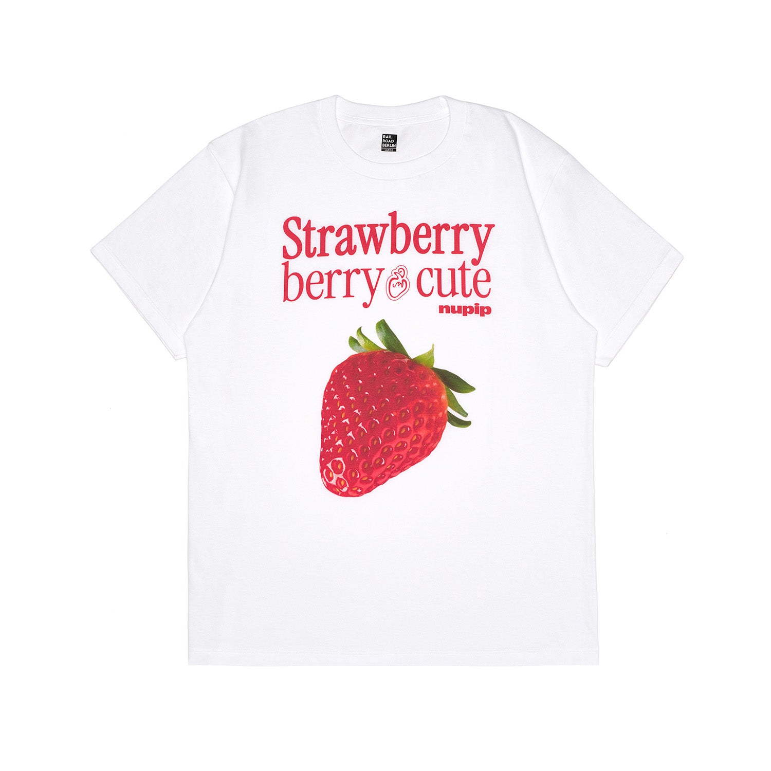 A white short-sleeve t-shirt featuring a strawberry graphic and lettering printed on the front. Made from 100% cotton in a relaxed, oversized fit for comfortable wear.