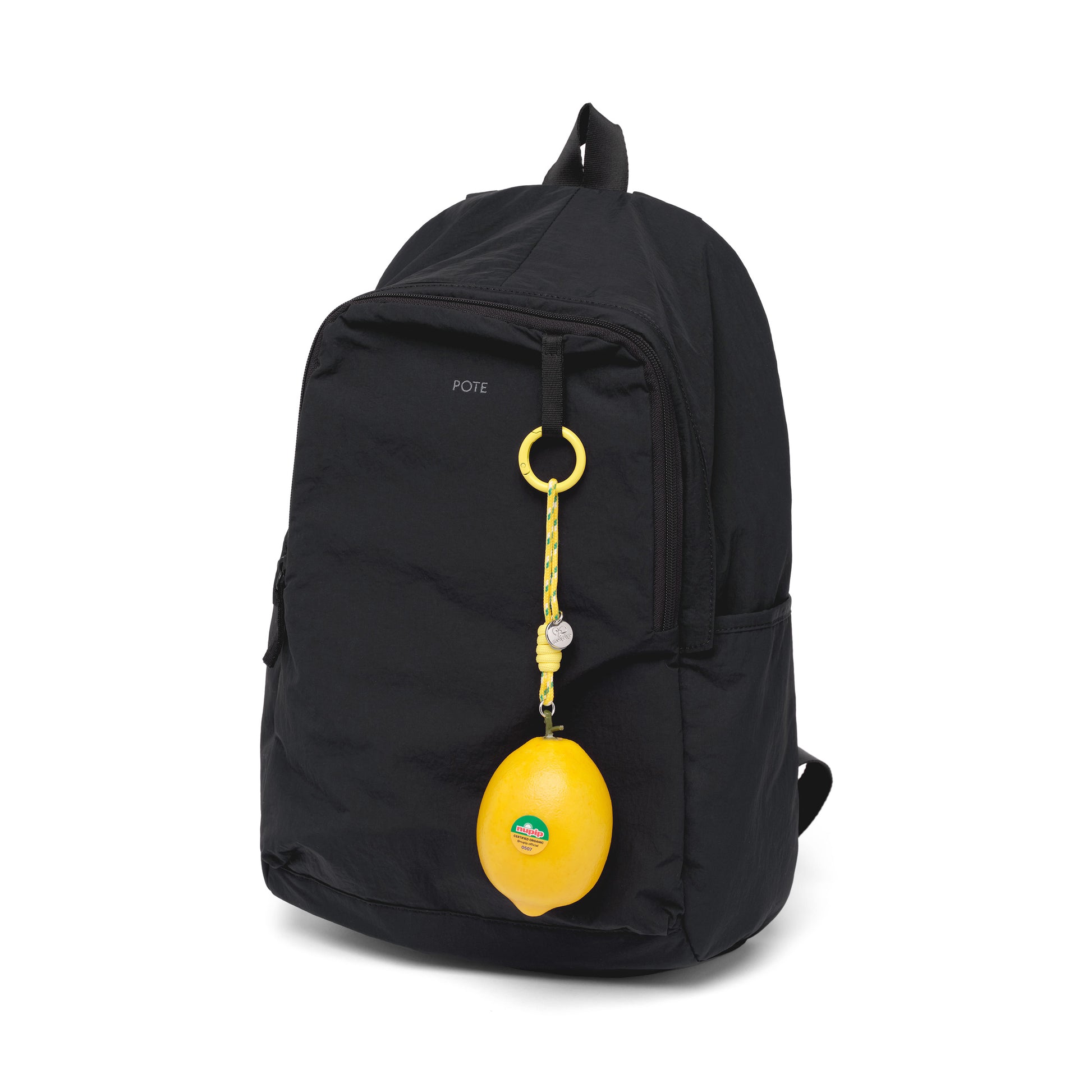This loop keyring is designed in the shape of a real lemon. It captures the look of a freshly picked fruit, detailed with a yellow strap, a lemon sticker, and a shiny silver pendant engraved with the NUPIP logo.
