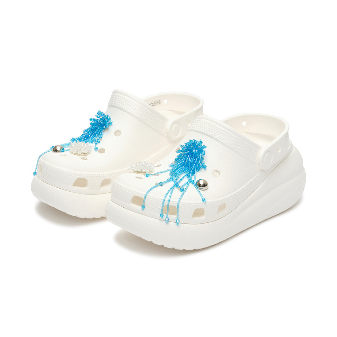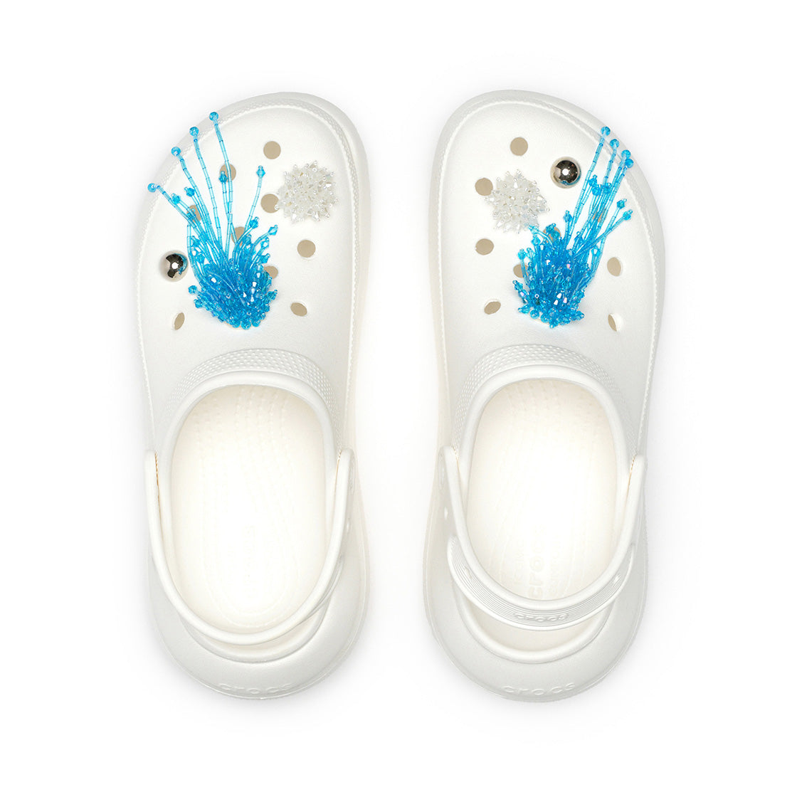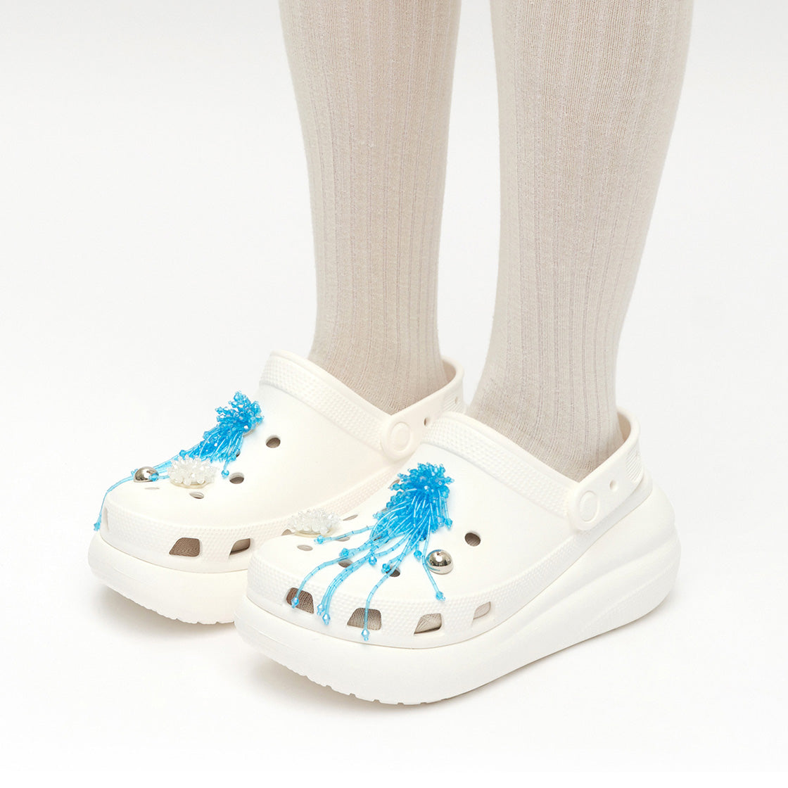 This pip set includes three handmade charms in blue tones. It features a drop-shaped bead, a mini-sized bead, and a round silver metal ornament—perfect for refreshing the look of your shoes.