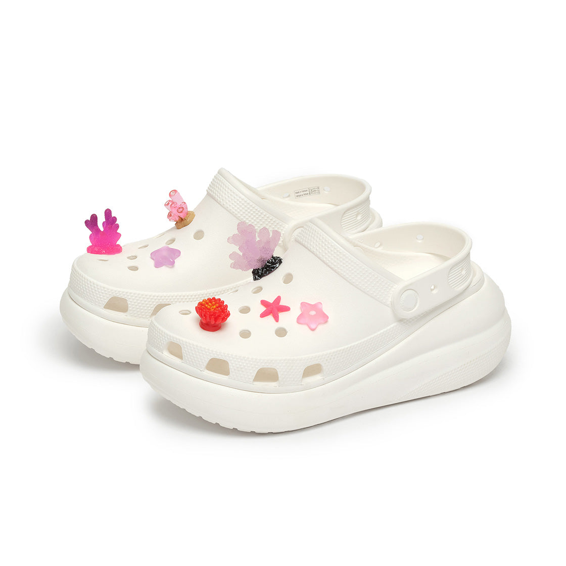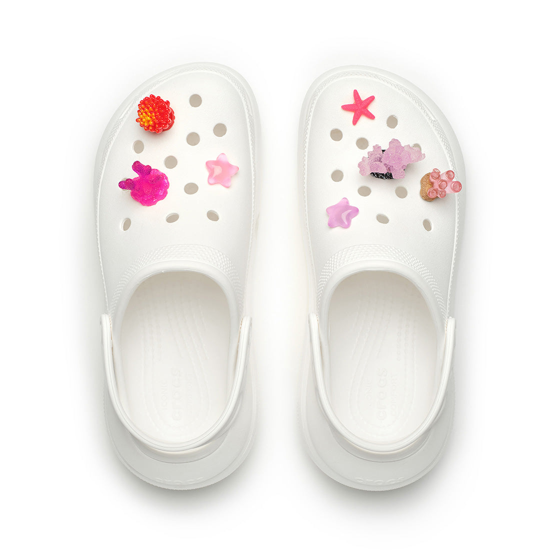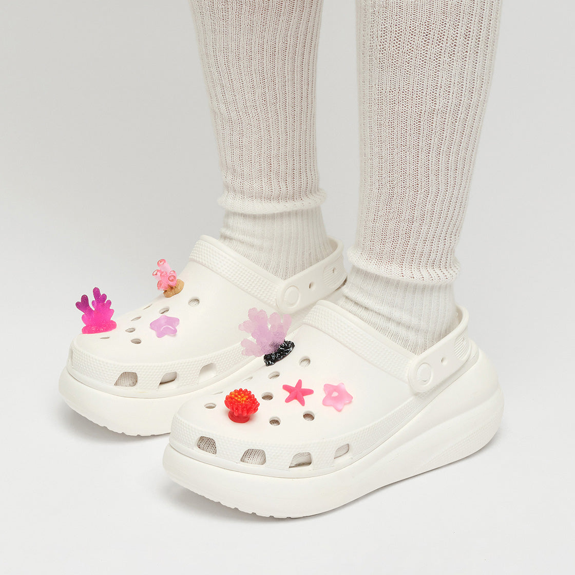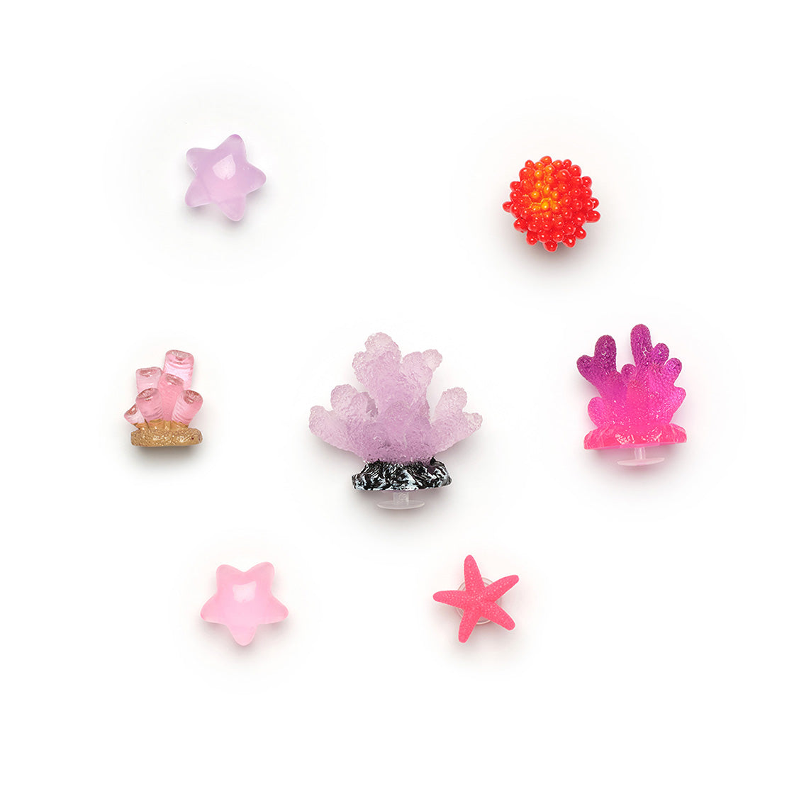 This pip set includes 7 ocean-inspired charms in dreamy pink tones, featuring coral and starfish motifs. Add a sparkling, under-the-sea touch to your shoes with these charming treasures.