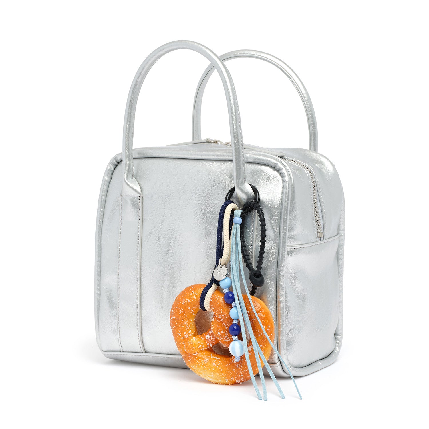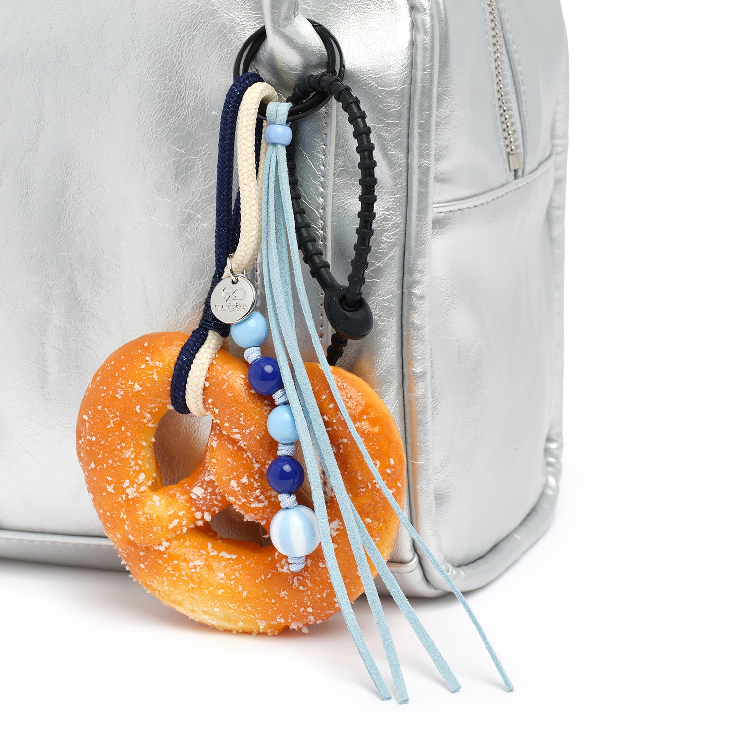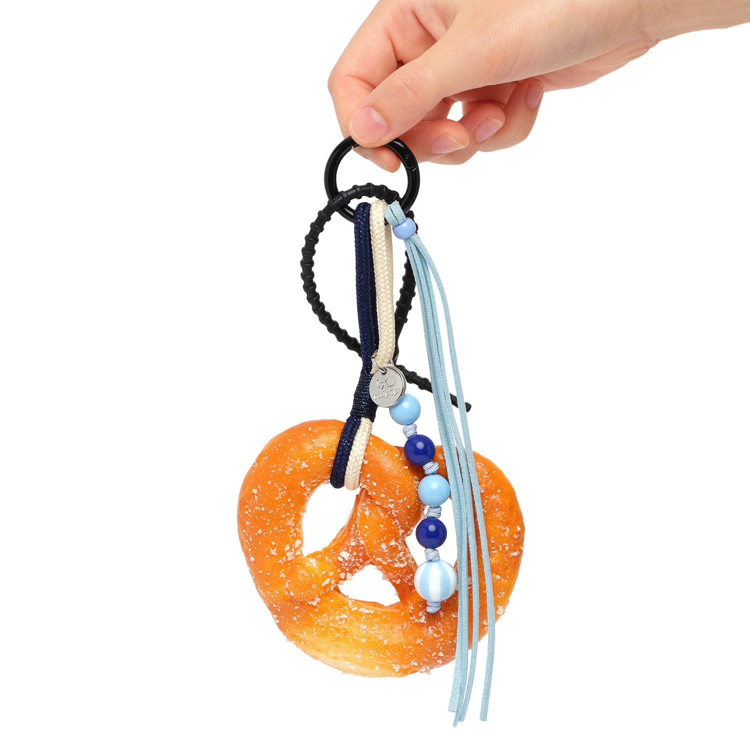 A keyring featuring a realistic pretzel shape with a soft, doughy texture and a subtle bread scent. Finished with blue-toned beads, a strap, and nupip’s signature silver logo charm.