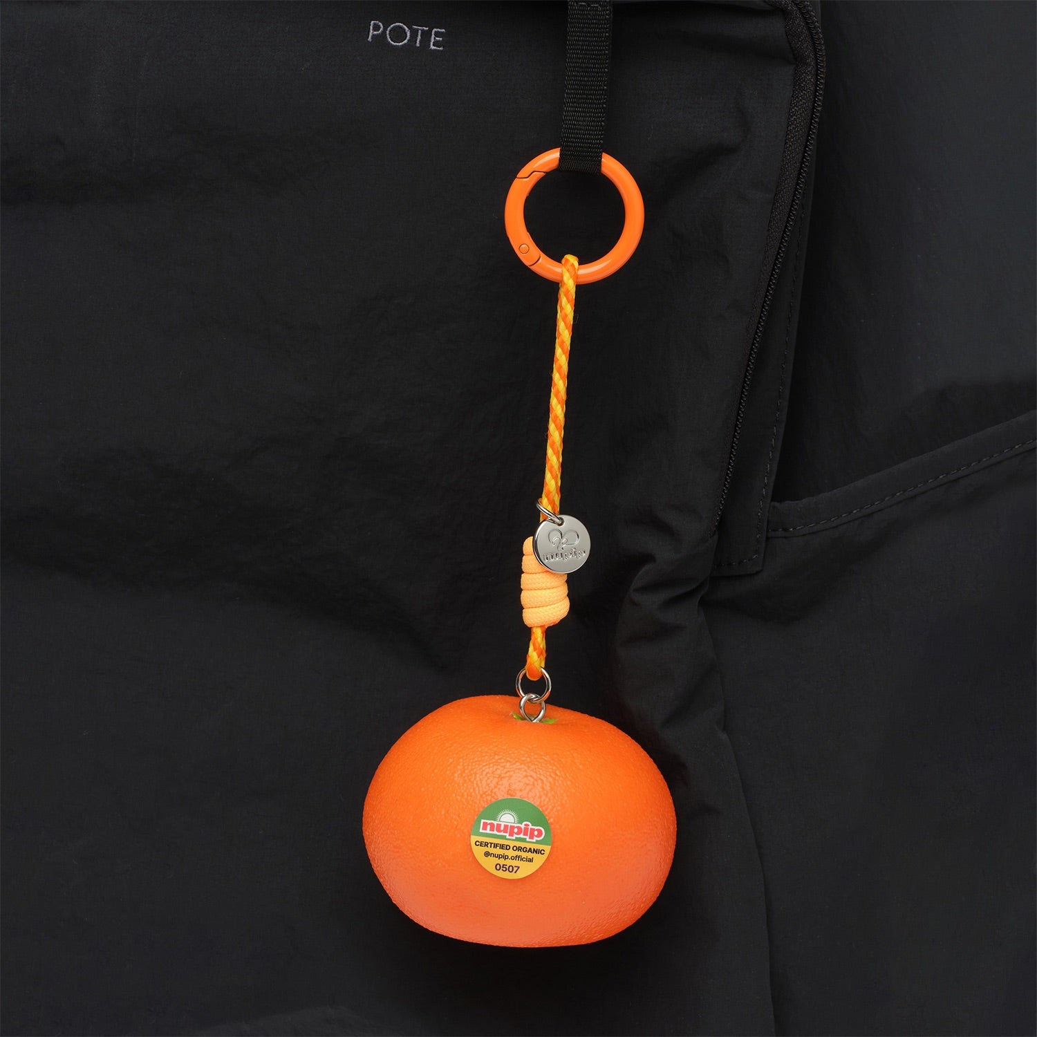 This loop keyring is designed in the shape of a real tangerine. It captures the look of a freshly picked fruit, detailed with an orange strap, a tangerine sticker, and a shiny silver pendant engraved with the NUPIP logo.
